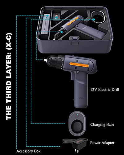 [Elektrowerkzeug-Kombikit mit 12-V-Akku-Bohrmaschine] Die C-Layer-Toolbox enthält einen 12-V-Elektrobohrertreiber und eine Zubehörbohrbox für Elektrobohrer. Eine Vielfältigkeit von Bohrern und Hülsen kann in Holz, Metall, Kunststoff usw. unterschiedlicher Dicke gebohrt werden.