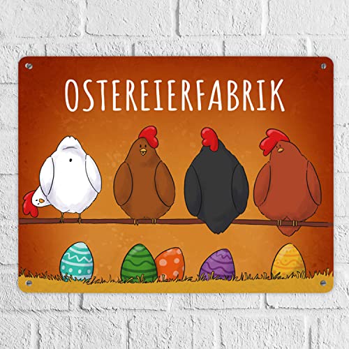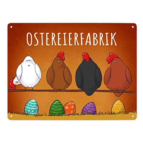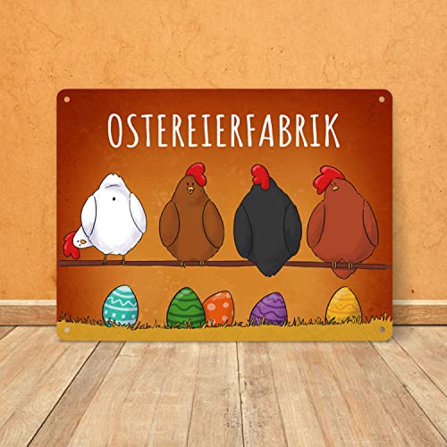 - Lieferumfang: 1x Hühner auf der Stange Ostereierfabrik Metallschild XXL in 28×38 cm mit bunten Ostereiern
