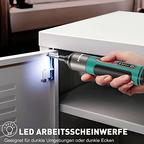【LED-LEUCHTEN & DREIECKIGE GRIFFE】 Die 4 vorderen LED-Leuchten eignen sich für dunkle Lichtecken. Akkuschrauber-Schubantrieb kann alias wie Taschenlampe verwendet werden, um an dunklen Orten zu beleuchten. Die Form des Griffs nimmt ein einzigartiges dreieckiges Design an. Der ergonomische weiche Gummigriff bietet ein angenehmes Gespür und Griffigkeit.