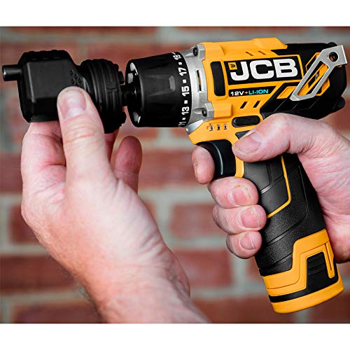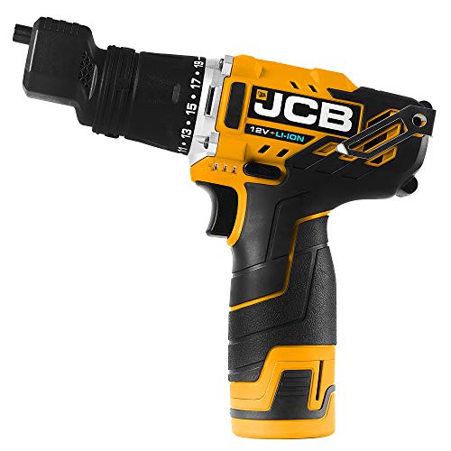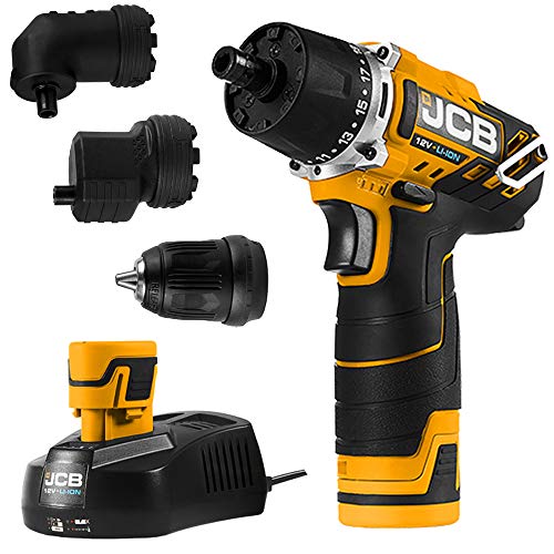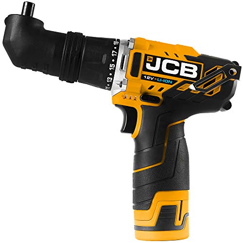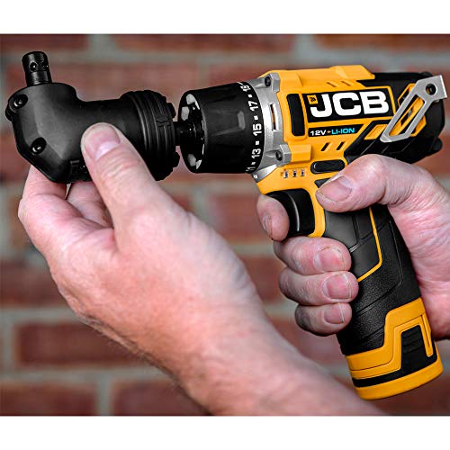 LIEFERUMFANG: JCB Speicherzelle-Bohrschrauber 12DD, Schnellspannbohrfutter, Winkelaufsatz, Exzenteraufsatz, 2x 12V Speicherzelle 2,0 Ah, Batterieladegerät
