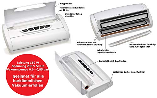 FUNKTION: kompakt, geringes Gewicht, variable Vakuumstärke durch Vakuum-Stop-Taste, separate Schweißfunktion, elektronische Temperaturüberwachung. Ihre Lebensmittel werden mit einer Vakuumleistung von ca. 90% bei -0,8 bar leistungsfähig vakuumiert. Für trockene und feuchte Lebensmittel (herausnehmbare Tropfschale), Pulse-Abzug für druckempfindliche Speisen