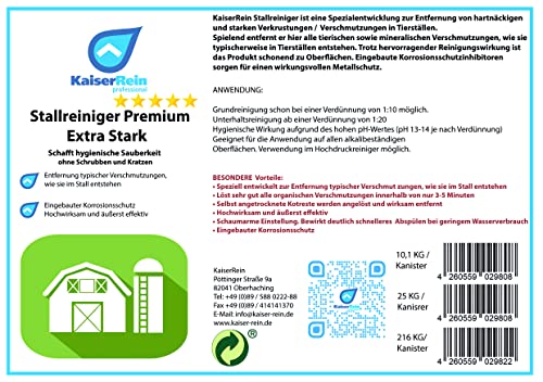 KaiserRein Stallreiniger ist eine Spezialentwicklung zur Beseitigung von hartnäckigen und starken Verkrustungen / Verschmutzungen in Tierställen. Spielend entfernt er hier alle tierischen sowie mineralischen Verschmutzungen, wie sie typischerweise in Tierställen entstehen. Trotz hervorragender Reinigungswirkung ist das Produkt schonend zu Oberflächen. Eingebaute Korrosionsschutzinhibitoren Acht geben einen wirkungsvollen Metallschutz.