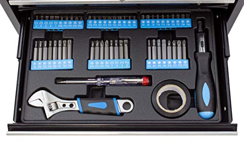 Inklusive Hammer, Zangenset, 1/4″ & 1/2″ Steckschlüssel unter Einsatz von umfangreichem Zubehör, Schraubenzieher, Cuttermesser, Bandmaß, Panzertape uvm.