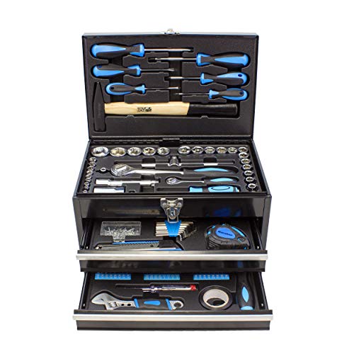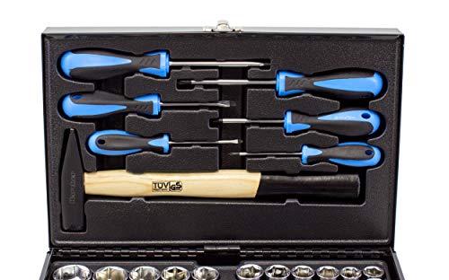 Inklusive Hammer, Zangenset, 1/4″ & 1/2″ Steckschlüssel mit umfangreichem Zubehör, Schraubenzieher, Cuttermesser, Maßband, Panzertape uvm.