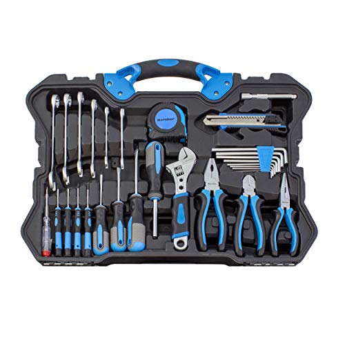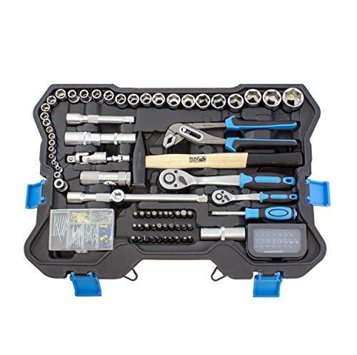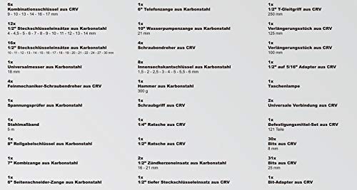 Inklusive Hammer, Zangenset, 1/4″ & 1/2″ Steckschlüssel mit umfangreichem Zubehör, Schraubenzieher, Cuttermesser, Taschenlampe, Maßband, Spannungsprüfer uvm.