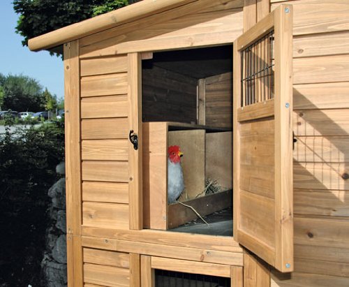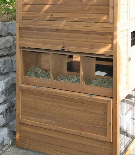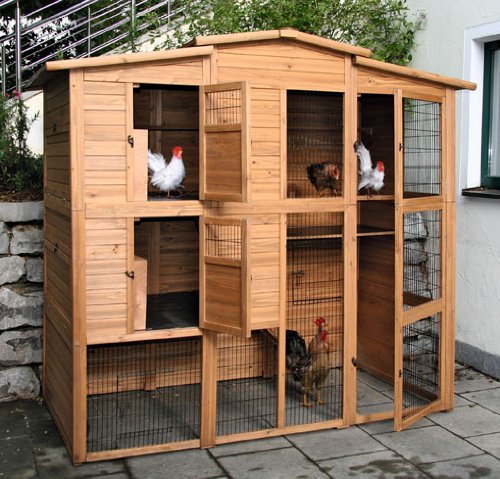 exklusives Hühnerhaus in stabiler Erledigung hochwertiges Gitter 6 Türen geteilt zu anbrechen und verriegelbar Produktmaße ohne Dach: 203 x 102,50 cm Böden kunststoffbeschichtet 2 Etagen per Treppe abhängig 2 Schiebetüren zum Gehege wetterfestes Bitumendach per Holzschutzfarbe lasiert Zubehör: 3 Legenester pro Etage, per Zugriffsmöglichkeit von außen, Ausgehrampe, 2 Holzsitzstangen im Gehege per kunststoffbeschichtetem Kotbrett Belieferung erfolgt zerlegt in 3 Kartons inkl. Aufbauanleitung und DVD/einfache Montage auf Basis von Stecksystem