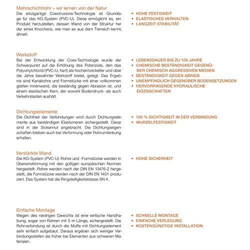Die KG-System (PVC-U)-Rohre und -Formstücke werden in Übereinstimmung mit den gültigen europäischen Normen hergestellt. Rohre werden nach der DIN EN 13476-2 hergestellt, die Formstücke werden nach der DIN EN 1401-1 produziert. Das System hat die Ringsteifigkeitsklasse SN 4. Dann wird eine hohe Sicherheit garantiert.