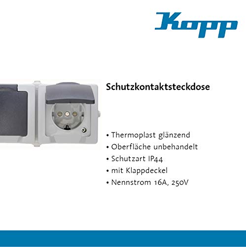 Qualität Made in Germany! Die 2-fach Steckdose mit selbstschließendem Deckel sorgt für eine zuverlässige Stromversorgung für viele Elektrogeräte im Innenbereich und im Außenbereich. Über die Schutzkontakt-Steckdose können viele Strom-Geräte, die über einen Schutzkontakt-Stecker, Konturenstecker oder Eurostecker verfügen, mit Strom versorgt werden. Die Aufputz-Steckdose ist kinderleicht zu montieren und verfügt über genügend Platz für Stromkabel. Mit der IP44 Zertifizierung ist die Steckdose vor Fremdkörpereinflüssen sowie vor Spritzwasser geschützt. Daher eignet sich die Schutzkontaktsteckdose ideal für die Verwendung in Waschräumen, im Keller, in Hobbyräumen, in der Garage, der Werkstatt oder auf der Terrasse und dem Balkon. Die hochklappbaren Deckel und der erhöhte Berührungsschutz umsorgen besondere (Arbeits-)Sicherheit. Zuverlässige Stromversorgung durch Kopp.