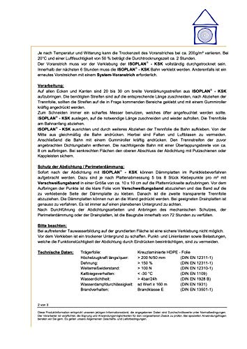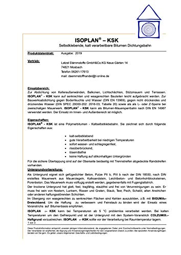 Zur Dichtung von Kelleraussenwänden, Stützmauern, Balkonen, Terrassen, Bodenplatten und Lichtschächten. Die Bahn kann auf senkrechten und wagerechten Bauteilen leicht aufgebracht werden. Zur Bauwerksabdichtung gegen Bodenfeuchte und nichtstauendes Sickerwasser (DIN 18195-4) sowie gegen nichtdrückendes Wasser (DIN 18195-5) Eigenschaften: Isoplan KSK ist eine Polymerbitumen Kaltselbstklebebahn Kalt-selbstklebend Gute Verarbeitbarkeit bei niedrigen Temperaturen Von jetzt auf gleich Wasser und Schlagregendicht Rissüberbrückend Lösemittelfrei Keine Haftung auf Silikonhaltigen Untergründen Stattdessen die sichere Überlappung sind auf der Oberseite beidseitig mit Trennstreifen abgedeckte Randstreifen vorhanden. Abhaltung: siehe unsere Verarbeitungsrichtlinien welche wir im Aktionspreis al Abdruck offerieren. Aktionspreis: Rollenlänge: 10 lfm – Breite 1000 mm Dicke 1,5 mm Technische Informationen Breite 1000 mm; Rollenlänge 10 m; Dicke 1,5 mm Verarbeitungstemperatur -5 bis + 30°C Untergrundtemperatur +5 bis +25°C Temperaturbeständig – 30 °C bis + 70 °C Rissüberbrückung 5 mm Brandverhalten Baustoffklasse B2 DIN 4102 – E – EN Wasserundurchlässigkeit bestanden 4 bar/24h Dauerelastischer Elastomerbitumen
