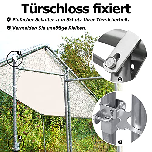 【Zäh und Langlebig】Der Körper von Hühnerstall ist aus hochwertigem, verzinktem Stahlrohr gefertigt, mit fester Struktur, rost- und korrosionsbeständig, was den Hühnerstall wetterfest und langlebig macht. Ideal für den langfristigen Einsatz im Freien.