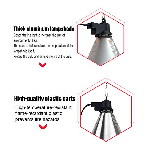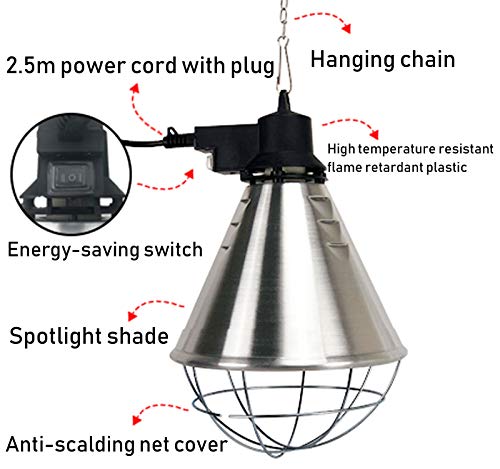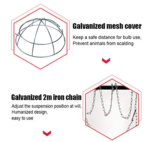 Einfache Installation: Die Hundeheizlampe ist mit einer 2 m langen verzinkten Eisenkette ausgestattet und die Aufhängeposition kann nach Belieben eingestellt werden. Das humanisierte Design ermöglicht es Ihnen, es nach Ihren Wünschen anzupassen, was bequem zu bedienen ist.