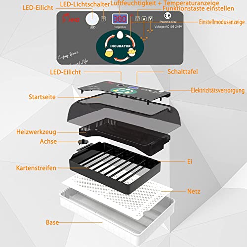 【LED-Anzeige und Temperaturkontrolle】: Die LED-Anzeige zeigt wichtige Informationen als Temperatur, Luftfeuchtigkeit, Brut- und Eierwendezeit an. Im Inneren befindet sich ein Temperatursensor, der die Temperatur empfindlich überwacht und den Strom abschaltet, wenn die Innentemperatur über der eingestellten Temperatur liegt.
