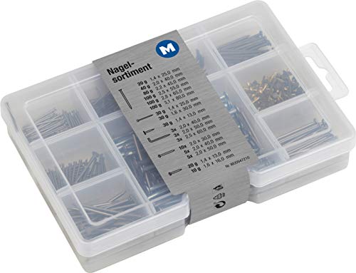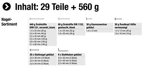 LIEFERUMFANG: 440 g Drahtstifte versenkt | 60 g Drahstifte gestaucht | 30 g Kammzwecken | 30 g Rundkopf-Stifte | 20 x Stahlnagel | 9 x Stahlhaken