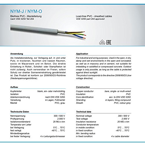 Strom Kabel NYM-J 3 x 1, 5 mm² Grau, Nennspannung 300/500 V, Kupfer eindrähtig, Abgeschiedenheit PVC, Verlegung in Putz, trockenen, nassen Räumen, im Beton, Mauerwerk. Hergestellt in Deutschland