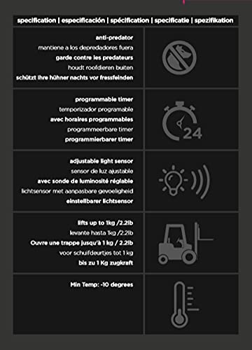 Sehr einfach zu installieren und einzurichten, mit Zeitschaltuhr und Lichtsensor-grafische Darstellung. My Chicken Door (MCD) ist so konzipiert, dass es sich selbst kalibriert, so dass Sie keine Zeit damit verschwenden müssen, die Position der Tür zum Hühnerstall einzustellen und zurückzusetzen – das wird alles automatisch und stressfrei für Sie erledigt!
