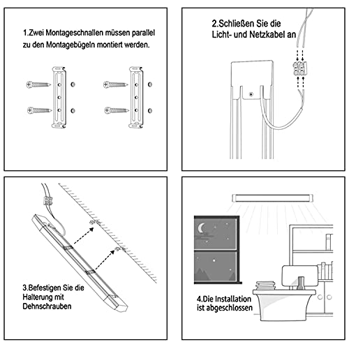 💡 【Einfachste Montage】: Anstelle diese Led Werkstatt Deckenleucht wird kein Lampenhalter benötigt. Sie wird mit 2 Schnallen, 2 Schrauben und 2 Wandstopfen geliefert. Sie müssen dennoch die Schrauben festziehen, um sie an der Wand oder Decke zu tragen.