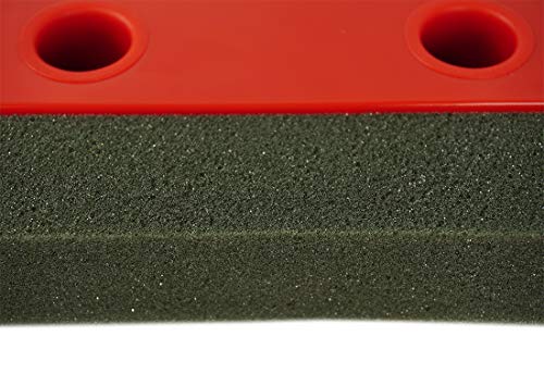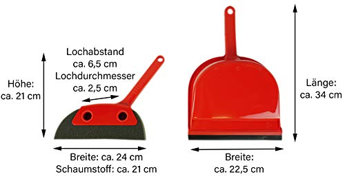 Maße des Handfegers (LxBxH): ca. 24 x 21 x 3 cm. Material des Kehrset Kunststoff „Borsten“ Schaumstoff Farbe: Rot Lochabstand: ca. 5,5 cm Lochdurchmesser: ca. 2,5 cm
