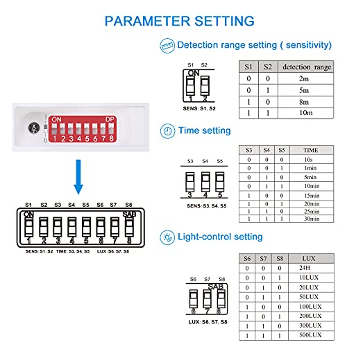 Einstellbar: Die Erfassungsweite, Haltezeit und Lichtempfindlichkeit von dieser LED Lampe kann aufgrund der Tatsache Vorwahl eingestellt werden. ➊Erfassungsweite: 2m/5m/8m/10m ➋Lichtempfindlichkeit:10LUX/20LUX/50LUX/100LUX/200LUX/300LUX/500LUX/disable. „disable“ bedeutet, dass der Sensor nicht aufgrund der Tatsache Beleuchtungsstärke beeinflusst wird ➌Haltezeit: 10S/1min/5min/10min/15min/20min/25min/30min