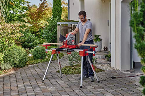 Das Untergestell von Einhell ist eine hochwertige Aluminiumkonstruktion für stationäre Geräte qua (Zug-) Kapp-/Gehrungssägen. Durch die Verlängerungen der Aufnahmeschienen bis 455 mm, können mit diesem Untergestell sogar größere Kappsägen montiert werden wie mittelmäßig. Ein höhenverstellbarer Fuß lässt sich auf unebenem Grund adaptieren. Die ergonomischen Schnellverschlüsse sorgen per Hebeldruck für eine schnelle und bequeme Beinfixierung. Der Schnellspannmechanismus für die ausziehbaren Werkstückauflagen mit materialschonenden Leichtlaufrollen sorgt für eine schnell vergrößerte Auflagefläche. An den Vorderbeinen befinden sich praktische Werkstückablagen und in den praktischen Boxen angebracht sind ebenso kleinere Ablagemöglichkeiten vorhanden.