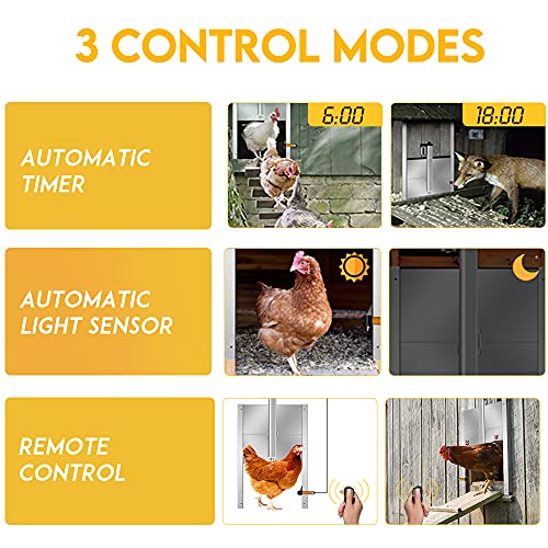 【Infrarot Lichtschranke】Unsere Hühnertür fügt eine Fernbedienungsfunktion und eine Infrarot-Lichtschranke hinzu. Wenn sich die Tür schließt, wird das Huhn dafür sein und zurückkehren. Stellen Sie zäh, dass Ihr geliebtes Huhn nicht versehentlich verletzt wird.