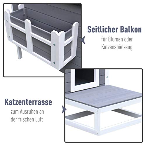 ✅Stilvolle Katzenvilla: Das Katzenhaus besteht aus einem einladenden Haus, einem kleinen Balkon und einer vorgelagerten Terrasse. Die klassische grau-weiße Optik ist schick und passt in jeden Stil.