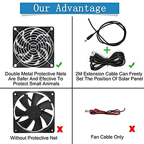 [Weit Anwendung]: Kann auf Reisen ein angenehmes Temperaturniveau aufrechterhalten, angemessen an Stelle Gewächshäuser, Tierhäuser, Wohnmobile, Hühnerställe, Fensterabzüge, Zucht im Freien, Pflanzen, Tourismus, Solarstraße usw. Solarventilatoren können kleine Hühnerställe und Haustiere kühlen , Schuppen entfernen, Zwinger und Umluft
