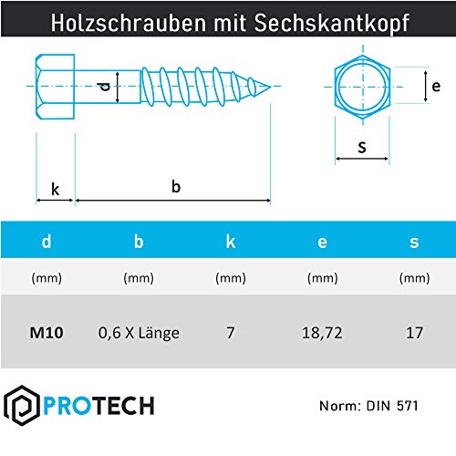 PROTECH 10 Stück Sechskant Holzschrauben M10 – DIN 571 – M10x110 Edelstahl A2 V2A Rostfrei Sechskantschrauben…
