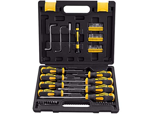 Proteco-Werkzeug 60 teiliger Schraubendreher Bit Satz im stabilen Kunststoffkoffer. Bestückt durch den gängigen Größen Schlitz in 4,0 x 75 mm, 6,5 x 100 mm, 8,0 x 150 mm sowie sonstige 4 Kreuzschlitz Schraubendreher PZ und PH in Größe 1 x 75 mm und PH 2 x 100 mm.Dazu ein Bithaltergriff und 17 gängige 1/4″ Bits, ebenso ein Präzisions Schraubendreher Heft und dazu 30 St Bits 4 mm anstatt kleinste Schrauben qua PH000 00 oder aka TX 4, 5, 6, 7 und Mix sonstige. Ergonomischer 2 Komponentengriff anstatt bessere Kraftübertragung und Ergonomie. Chrom Vanadium Stahl, matt verchromt durch schwarzer Spitze anstatt Passgenauigkeit. Loch im Heft zum Einstecken eines Hebels, z. B. einer anderen Schraubenzieherklinge. Abrollschutz, eingespritze Klinge und gerne anstatt gewerbliche Bestellen einsetzbar.