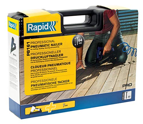 Lieferumfang: 1 Stk. Rapid Druckluftnagler PB161, Kunststoffkoffer, Sechskantschlüssel, 300 Nägel am Lebensabend 32 50 mm Länge, Euro und Orion Kupplung, 5000104, Abmessungen BxHxT: 33,0×34,0x9,0 cm, Gewicht: 2.250 g