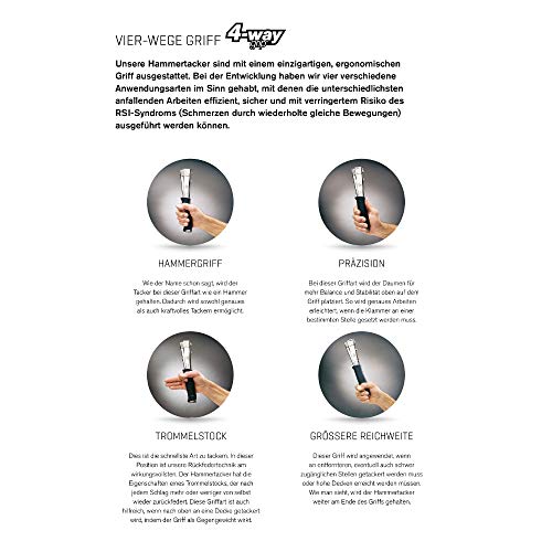 Zugunsten schnelles Abstützen von Material auf Holz mit einer großen Anzahl von Klammern z.B. Dachpappe, Schindeln, Isolation, Kunststofffolien und Dampfsperren. Abzgl. Kraftaufwand und geringere Belastung durch Rückfedertechnologie