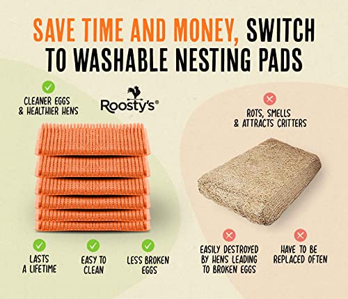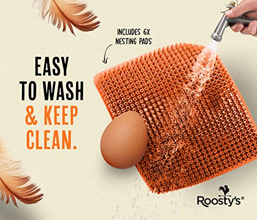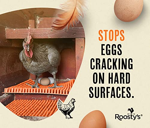 Halten Sie Ihre Mädchen glücklich – die meisten Hühner nehmen sie sofort zu sie, dagegen wenn sie nicht, empfehlen wir Ihnen, Roosty’s Keramiknesteier hinzuzufügen, bis sie regelmäßig liegen. Mit weniger Kehricht in der Lage zu bauen und weit mehr Eier überleben, sind die Eierlegmatten letzten Endes sicherer, sauberer und wirtschaftlicher für Sie und Ihre Damen. Die waschbaren Nistunterlagen für Hühner widerstehen auch Tierarten weitaus besser als Heu, Stroh oder Grasstreu. Wir fügen auch unser E-Book „How To Raise Happy, Healthy Hens“ hinzu, um neuen Besitzern zu helfen