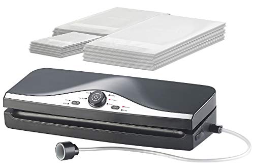 Einfache Bedienung: vollautomatisches Vakuumieren und Versiegeln von Lebensmitteln • Erzeugt Durchschlag-Schweißnaht für besonders sicheres Terminieren • Integrierter Cutter: Vakuumier-Folien direkt am Gerät sensen • Gummifüße für sicheren Stand • Leistungsaufnahme: 150 Watt • Vakuumierer inkl. 15 Beuteln (5x 10 x 15 cm, 5x 20 x 30 cm, 5x 28 x 40 cm), Vakuumier-Schlauch mit 2 Aufsätzen, Ersatz-Abdichtring und deutschem Handbuch