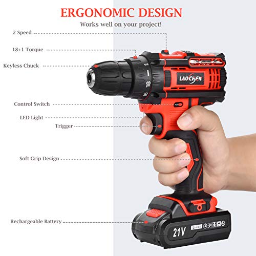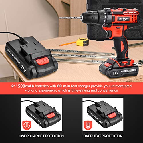 🛠21V 1500mAh LI-ION-BATTERIEN — Dieser Akku-Bohrtreiber mit 2 Stück 1500mAh Lithium-Ionen-Akkus bietet Ihnen eine enorme Leistung und eine ausreichende Laufzeit von 2 bis 3 Stunden, nachdem Sie das kostenlose Schnellladegerät 1 Stunde lang aufgeladen haben. Wenn eine der Batterien leer ist, können Sie die zusätzliche Batterie jederzeit austauschen und ständig an Ihrem Projekt arbeiten.