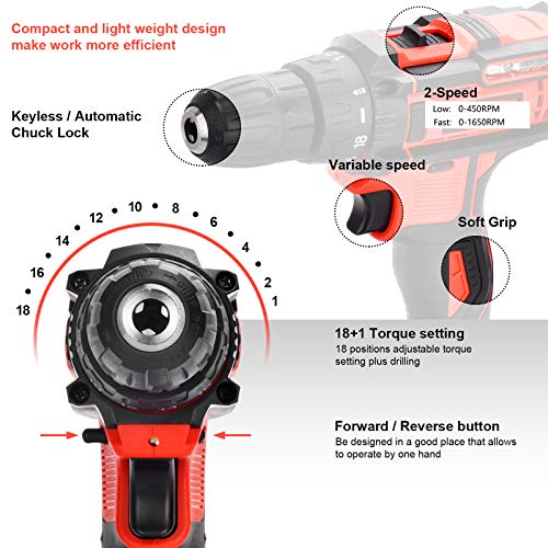 🛠2 VARIABLE GESCHWINDIGKEITEN UND STEUERUNGEN — Hat 2 einstellbare Geschwindigkeiten, von denen die langsamere 0-450 U / min für die meisten täglichen Schrauben ist und die maximale Geschwindigkeit 0-1650 U / min ist, was perfekt zum Bohren von Löchern ist. Darüber hinaus verfügt der Bohrschrauber über Vorwärts- und Rückwärtshebel, mit denen Sie die Bohrkronen für Ihre Zwecke festschrauben oder substituieren und den Bohrschrauber zäh verrammeln können.