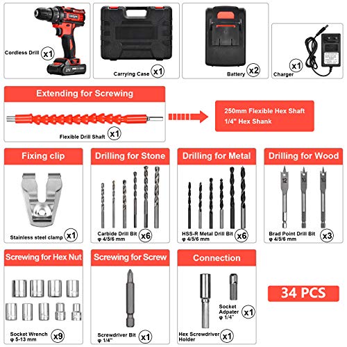 🛠EIN KOMPLETTES KIT — Kommt mit 1 Bohrschrauber, 2 1500-mAh-Lithiumbatterien, 1 Tragetasche, 1 Batterieladegerät und 28 Zubehörteilen, darunter 1 flexible Bohrwelle, 9 Steckschlüssel, 3 Holzbohrer, 3 weiße Spiralbohrer, 3 Schlagbohrer, 3 schwarze Spiralbohrer, 3 flache Tischlerbohrer, 1 Pleuelstange, 1 Schraubendreherbohrer und 1 Muffenadapter.