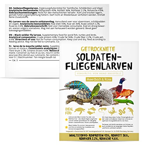 🐟 Mit mehr als 40% Proteinen und den vielen enthaltenen Vitaminen sind getrocknete Soldatenfliegenlarven ein optimaler Energielieferant. Die Würmer lassen sich leicht zerreiben und können so aka problemlos an kleinere REPTILIEN, WILDVÖGEL und FISCHE verfüttert werden. Getrocknete Black Soldiers Flys für Tierfutter sind aufgrund einer anderen Verarbeitungsweise für den menschlichen Verzehr nicht entsprechend!