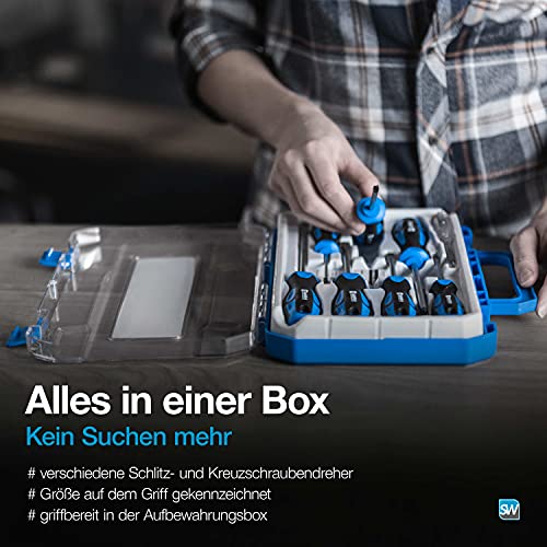 Kein Forschen mehr – Die unterschiedlichen Schlitz- und Kreuzschraubendreher sind mit Ihrer Größe auf dem Griff gekennzeichnet, somit ist der passende Schraubendreher allzeit sofort Griffbereit.
