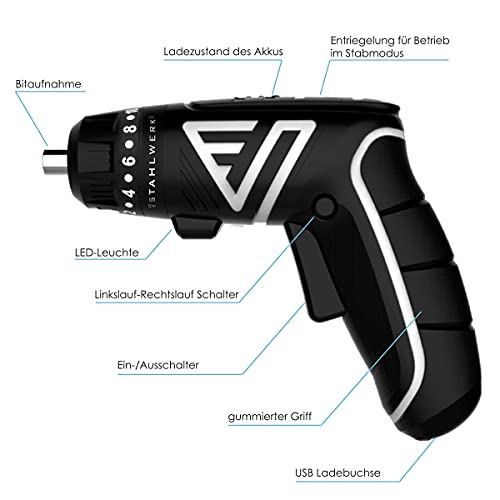 STAHLWERK Akkuschrauber mit leistungsstarkem 3,6 V/1,3Ah Akkumulator System inklusive Bit Set und Transport Box.