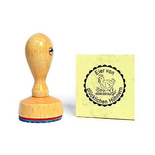 Sie erwerben einen schönen Stempel mit Hühner-Motiv. Eine Personalisierung des Textes ist womöglich. Klicken Sie bitte auf ‚Neuzeitlich Gleichsetzen‘ und teilen uns Ihren Wunsch dort mit. Wenn Sie den Text ‚Eier von glücklichen Hühnern‘ gerne so lassen möchten, geben Sie ihn einfach so in der Abwandlung ein.