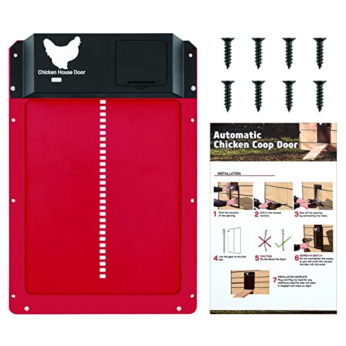 Einfach Tür mit 6 mitgelieferten Schrauben an den Hühnerstall schrauben, Sicherheitsband ablösen, fertig. Die Türen funktionieren von selbst mithilfe von Lichtsensortechnologie, sodass sie mit dem Morgenlicht nach oben und nach hinunter gehen, wenn kein Licht in der Nähe ist.