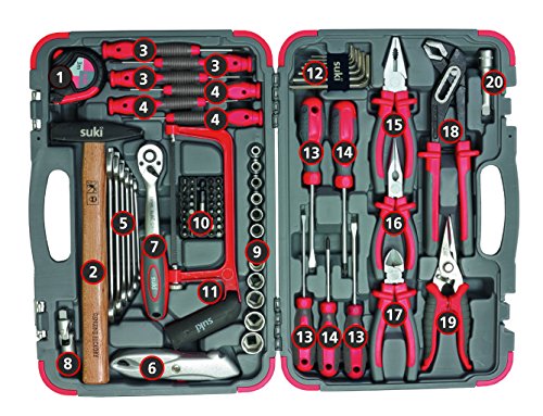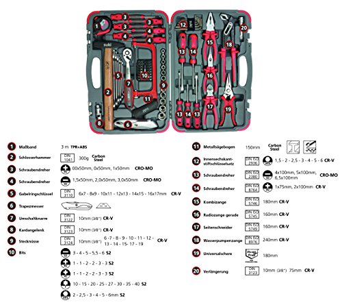 Das Multitalent sondern ganz Fälle Ob Schrauben, Kürzen, Greifen, Abkuppeln, Biegen, Abgreifen oder Hämmern – mit alles in allem 81 Teilen bietet der suki Werkzeugkoffer was auch immer, was der Profi oder Heimwerker braucht. Und das bei möglichst handschonender Nutzung durch den 2 Komponenten Anfasser mit weicher Gummieinlage. Robuste Qualität, die lange hält Der Chrom-Vanadium-Stahl verleiht den einzelnen Werkzeugen eine ausgezeichnete Zähigkeit, Härte und Konstanz. Zusammen mit dem stabilen Koffer profitieren Sie von einer hochwertigen Qualität, die sich sondern Sie langfristig bezahlt macht.