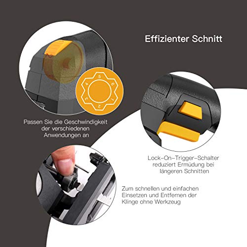 ▲ FLEXIBEL EINSETZBAR – 6 variable Geschwindigkeiten: 0 bis 3000 Hübe pro Minute; 6 Sägeblätter (4 zum Sägen von Holz: 100 mm, 2 zum Sägen von Metall: 10 mm) und 4 wählbare Orbital-Vorschübe, um die unterschiedlichen Schnittanforderungen anzupassen