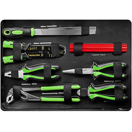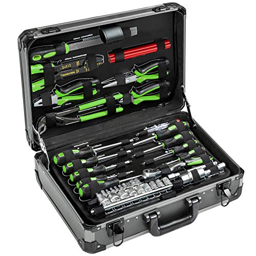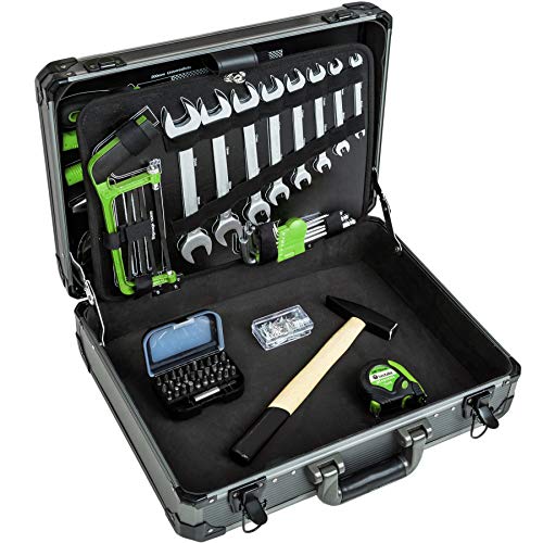 Praktisches und umfangreiches Werkzeugsortiment im leichten aluminiumverstärkten Werkzeugkasten.