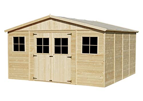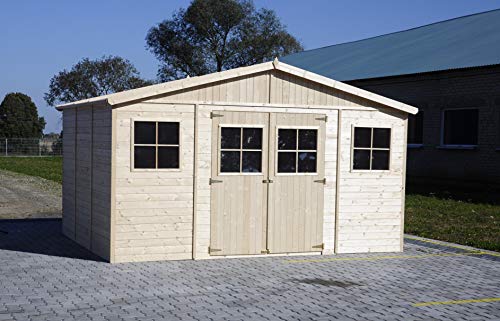 Holz Gartenschuppen MIT IMPRÃGNIERTEM Boden – Abstellkammer mit Fenstern – H246 x 418 x 420 cm/ 16 m² Naturholz-Shiplap-Schuppen – Gartenwerkstatt – Fahrrad- Geräteschuppen TIMBELA M330+330G
