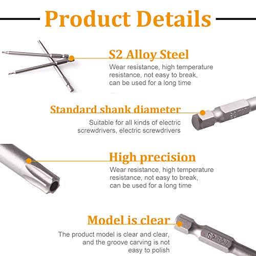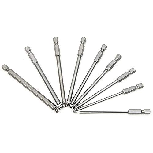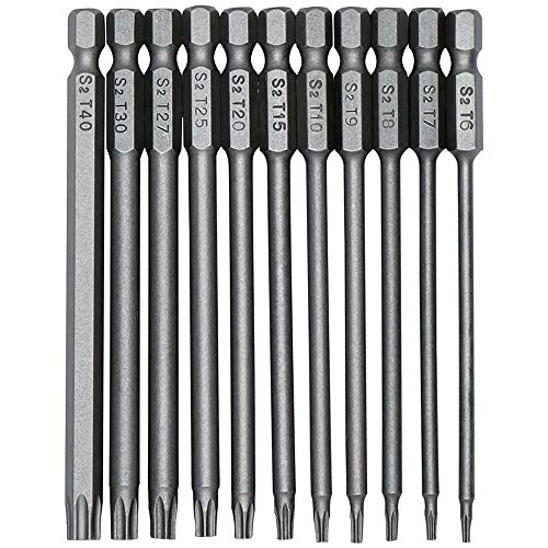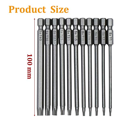 【T6-T40 100mm Lang Sechskant-Schaft】 Länge von 10cm , das interne hohle Design macht es arbeitssparender. Es ist die Größen T6 T7 T8 T9 T10 T15 T20 T25 T27 T30 T40 um Ihre unterschiedlichen Bedürfnisse zu zu Potte kommen, kompatibel für elektrische Schraubendreher, Handschraubendreher, Luftbohrer, Schlagschrauber und so weiter.