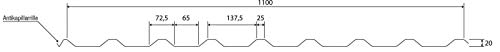 Das Trapezprofil PS20/1100TRA aus Stahl hat eine Höhe von 20 mm, eine Nutzbreite von 1100 mm, eine Stärke von 0,50 mm und wiegt ca. 5,00 kg/m². Diese Trapezbleche werden auf feiner Unterschied bis 9 m produziert.