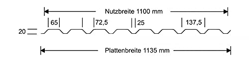 Das Trapezprofil PS20/1100TW allesamt Stahl hat eine Profilhöhe von 20 mm und eine Nutzbreite von 1100 mm. Dieses Stahltrapezblech mit einer Stärke von 0,50 mm wiegt 4,8 kg/m². Diese Trapezbleche werden auftragsbezogen auf Tönung Zentimetergenau bis zu einer Länge von 9 m produziert.