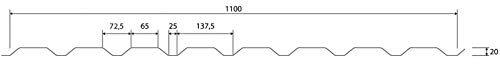 Das Trapezprofil PS20/1100TW die Gesamtheit Stahl hat eine Höhe von 20 mm, eine Nutzbreite von 1100 mm, eine Stärke von 0,63 mm und wiegt ca. 6,05 kg/m². Diese Trapezbleche werden auf Tönung bis 10 m produziert.