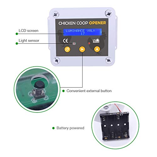 【Einfach zu bedienen】 Der automatische Hühnerstall-Türöffner ist mit einem voll ausgestatteten LCD-Bildschirm ausgestattet. Öffnen Sie morgens und schließen Sie abends automatisch, indem Sie den Timer einstellen oder den leicht einstellbaren Sonnenlichtsensor verwenden, um Ihre Hühner vor Raubtieren zu schützen.