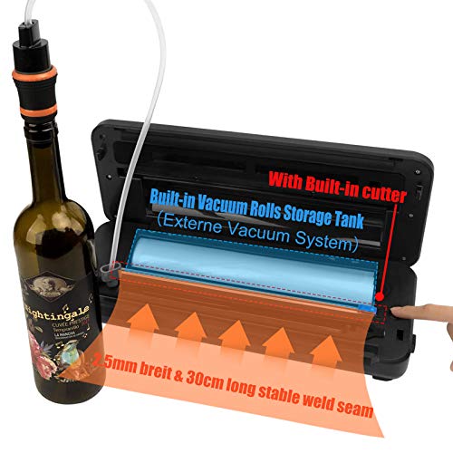 🍎【Eingebaute Cutter & Rollenspeicher】: Entwickelt mit eingebautem Rollenspeicher und eingebautem Cutter, kann Vakuumrollen bequem aufbewahren und einfach einen maßgeschneiderten Vakuumbeutel herstellen.